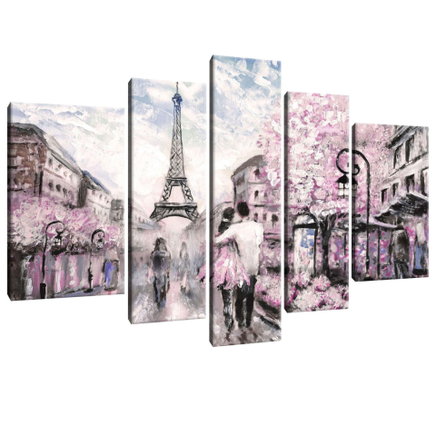 Párizsi Városkép 5 részes Vászonkép szett - 100x170 cm Élvezze Párizs romantikus hangulatát ezzel a gyönyörű 5 részes vászonkép szettel! A képek a város ikonikus látnivalóit, a párizsi utcákat és egy szerelmes párt ábrázolják gyönyörű, pasztell színe...