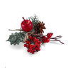 Vegyes bogyós pikk almával, mérete 22 cm. Vegyes apró dekoráció terméssel, zölddel és masnival. Merevített szára zöld-barna színű krepp papírral betekert. Alulról 3 darab dombornyomott, hamvas festésű, tüskés szélű magyal levéllel kezdődik, fölötte méregzöld-fehér átmenetes ciprus mű zöld található. Mélyvörös almájának alapja hungarocell, mellette egy igazi, erdei fenyő toboz foglal helyet. Fölöttük durva anyagból drapp-barna masni dobja fel a termé