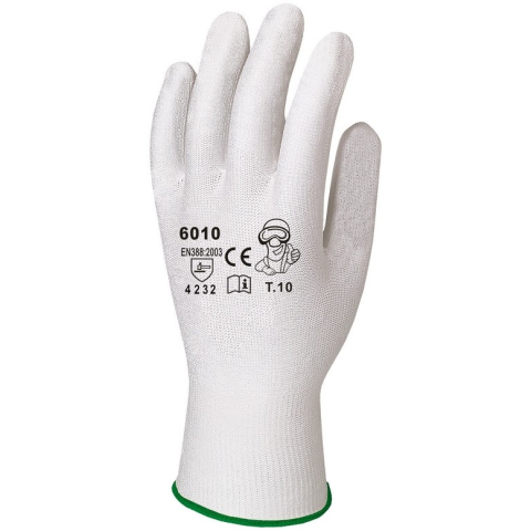 VÉKONY FEHÉR POLIÉSZTER KESZTYŰ: • fehér színű, 13-as kötésű, rugalmas nagy szakítószilárdságú 100% poliészter szál • kényelmes, a kézre tökéletesen illeszkedik, kiemelkedően magas fogásbiztossággal és jó kopásállósággal • MÉRET: 10-es • CSOMAGOLÁS: 100/10 • EU szabvány: EN420, EN388: 4232X