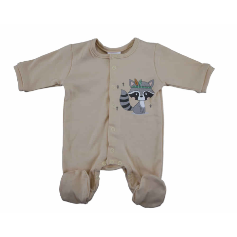 Vékony, pamut, elöl patentos kisfiú rugdalózó Mosómedve mintával Praktikus és kényelmes viselet ez a nagyon vagány Mosómedve mintával nyomott baba rugdalózó. Elöl patentos megoldás, mely megkönnyíti a peluscserét és az öltöztetést.