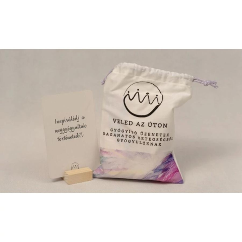 A "Veled az úton" egy gyógyító üzeneteket tartalmazó szuggesztiós kártyacsomag, melyet daganatos betegségből gyógyulóknak készítettünk. Ideális segítséget nyújthat mind az érintetteknek, mind pedig a terapeutáknak a gyógyulási folyamat támogatásában. A szütyő 52 üzenetet tartalmaz, valamint 12 üres kártyalapot, hogy új gondolatoknak is teret biztosítsunk és a csoportos használat során mindenkinek jusson üres lap. Mellékeltünk továbbá egy használati javas