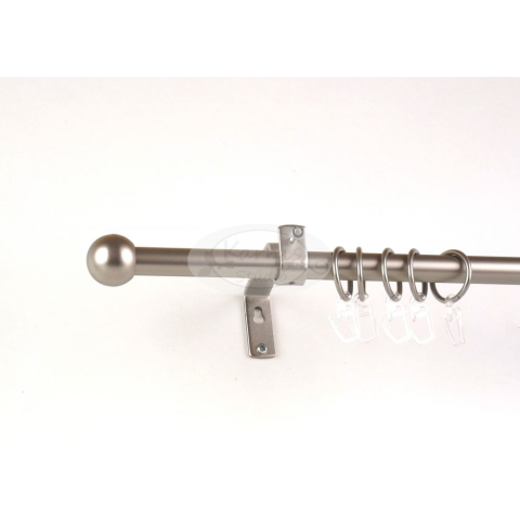 A VESZPRÉM nikkel-matt színű 120 cm-es 1 rudas fém karnis szett tartalma: 1 db 120 cm-es nikkel-matt színű, 16 mm átmérőjű fém karnisrúd 2 db Veszprém típusú nikkel-matt színű fém végzáró 2 db falra szerelhető fém konzol a felszereléshez szükséges tipli