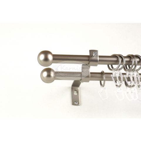 A VESZPRÉM nikkel-matt színű 200 cm-es 2 rudas fém karnis szett tartalma: 2 db 200 cm-es nikkel-matt fém karnisrúd 4 db Veszprém típusú nikkel-matt színű végzáró 2 db falra szerelhető fém konzol 40 db fém függönykarika műanyag ráncszedő kampóval vagy csi