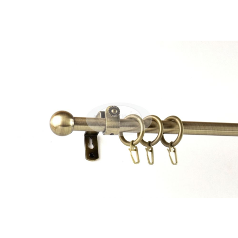 A VESZPRÉM óarany színű 115 cm-es 1 rudas fém karnis szett tartalma: 1 db 115 cm-es óarany színű fém karnisrúd a választott hosszúságban 2 db Veszprém típusú óarany színű gömb alakú fém végzáró 2 db falra szerelhető fém konzol a felszereléshez szükséges