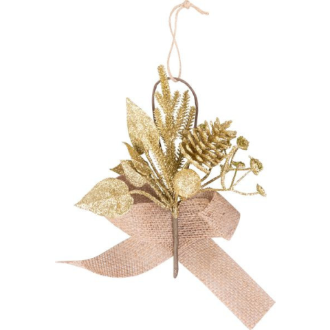 1 kép Vetvička MagicHome Vianoce, so šiškou a jutovou stuhou, zlatá, 17 cm