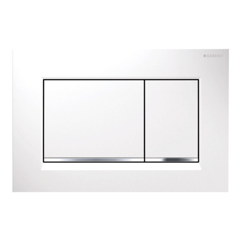 A Sigma30 dizájnos, kettős működésű vezérlőgomb fehér, krómozott fényes csíkban, a jól ismert GEBERIT cégtől, a Geberit Sigma rejtett tartályok öblítésének vezérlésére, így minden fürdőszobába megfelelő választás. A gomb csak a Geberit Sigma modulokkal kompatibilis, a Geberit Delta modulokkal nem kompatibilis.