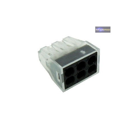 Vezeték összekötő 6 pólusú Hajlékony és merev vezetékek esetén is alkalmazható, azonban a hajlékony vezetékekre érvéghüvelyt kell sajtolni. Névleges feszültség: 400V Áram : 24A Maximális vezeték kersztmetszet: 2.5mm2
