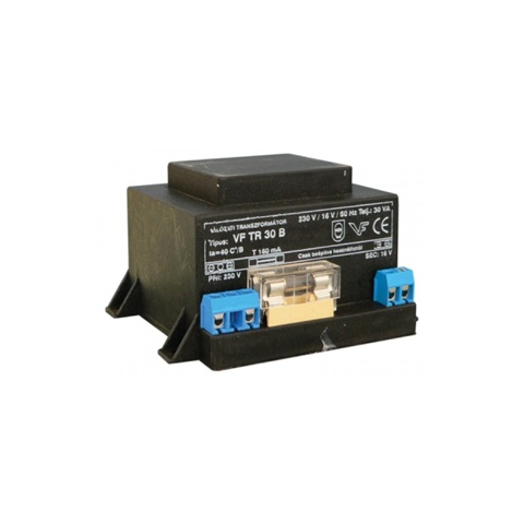 Beépíthető transzformátor biztosítékkal, riasztókhoz A tápegység tulajdopnságai Zárt, műgyantával kiöntött transzformátor Kettős szigetelésű kivitel Sorkapcsos csatlakozási lehetőség Primer oldal: 230VAC/160mA, üvegbiztosítékkal védett Szekunder oldal: 16VAC/30VA