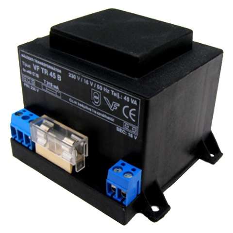 Beépíthető transzformátor riasztókhoz biztosítékkal A tápegység tulajdonságai Zárt, műgyantával kiöntött transzformátor Kettős szigetelésű kivitel Sorkapcsos csatlakozási lehetőség Primer oldal: 230VAC/315mA, üvegbiztosítékkal védett Szekunder oldal: 16VAC/45VA