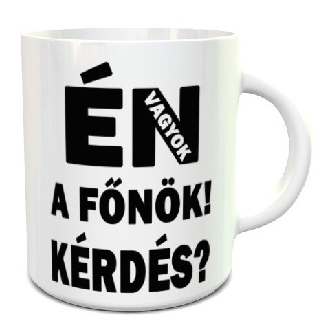 Humoros feliratos bögre, én vagyok a főnök. Én vagyok a főnök, kérdés? Humoros feliratos bögre főnököknek, de akár apukáknak, anyukáknak vagy gyerekeknek is tökéletes lepd meg Te is a Tiédet, ha éppen a születésnapja vagy névnapja közeleg. A választható s