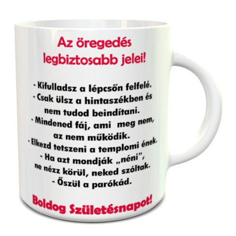 Szülinapi bögre nőknek, öregedés jelei. Vicces feliratos bögre nőknek. Lepd meg barátnődet, kolléganődet egy olyan bögrével, ami később minden nap mosolyt fog csalni az arcára amikor használja. Válassz többféle kerámia, zománc vagy üveg bögréink közül.
