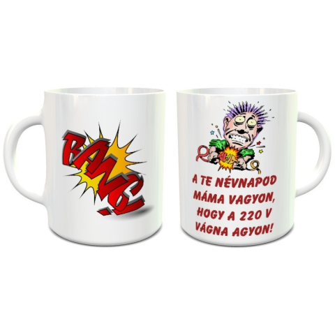 Vicces névnapi bögre, névnapod máma vagyon. Humoros bögre névnapra haverodnak vagy villanyszerelőknek rendeld meg névnapjára, biztosan örülni fog neki. A Te névnapod máma vagyon, hogy a 220V vágna agyon poénos feliratos bögre. Rendelj mellé díszdobozt is