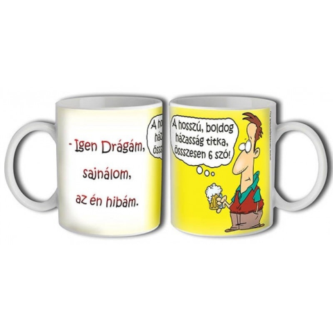 Vicces bögre, A hosszú, boldog házasság titka, 6 szó. Igen drágám, sajnálom, az én hibám. 3 dl Anyaga: kerámia Befoglaló mérete: 12 x 8 x 9,5 cm