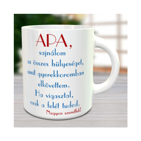 Vicces bögre apáknak, sajnálom a hülyeséget. Feliratos bögre édesapáknak. Ha úgy érzed eljött a beismerés ideje, de nem tudod hogyan mondd el.. segítünk, mondd el bögrével. A bögrék zománc, üveg és kerámia anyagra kérhető, kerámia bögréink széles színvál