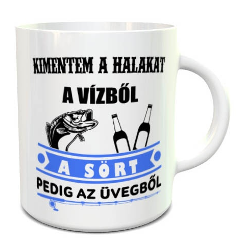 Vicces pecás bögre, kimentem a sört. Kimentem a halakat a vízből a sört pedig az üvegből, vicces ajándék horgászoknak. Lepd meg vele horgásztársad, barátodat, ha szeretitek a sört és imádtok horgászni is együtt. Rendelj egy szuper pecás bögrét neki és mag
