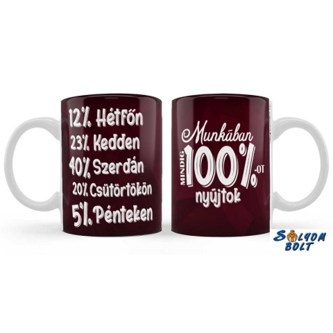 Feliratos kerámia bögre 3 dl Befoglaló mérete: 12 x 8 x 9,5 cm Biztosan csodálkoztok, ha megnézitek a bögre egyik oldalát: Munkámban mindig 100%-ot nyújtok. De ha megnézitek a másik oldalát is, már nem csodálkoztok: 12% hétfőn 23% kedden 40% szerdán 2