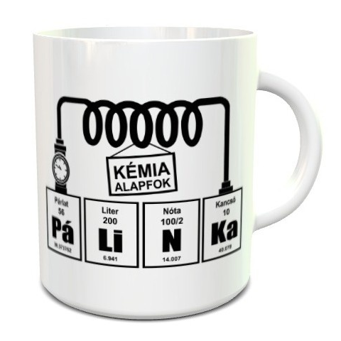 Vicces bögre, pálinka bögre. Kémia alapfok csakis igazi pálinka szakértőknek. Ajándék születésnapra, névnapra minden pálinka kedvelő férfinak és nőnek. A bögre és a minta színét is Te választhatod ki ezzel egyedivé téve a meglepetést. Egyedi nyomtatású