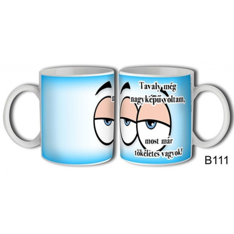Vicces bögre, Tavaly még nagyképű voltam, most már tökéletes vagyok. 3 dl Anyaga: kerámia Befoglaló mérete: 12 x 8 x 9,5 cm