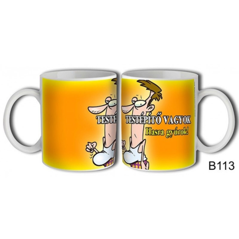 Vicces bögre, Testépítő vagyok, hasra gyúrok 3 dl Anyaga: kerámia Befoglaló mérete: 12 x 8 x 9,5 cm