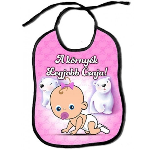 Tréfás, vicces előke, pártedli. Praktikus, aranyos ajándék kisbabáknak, kisgyerekeknek. Vicces ajándék felnőtteknek. Anyaga: polyester Mérete: 26 x 33 cm Természetesen minden szülőnek a saját kislánya a környék legjobb csaja.