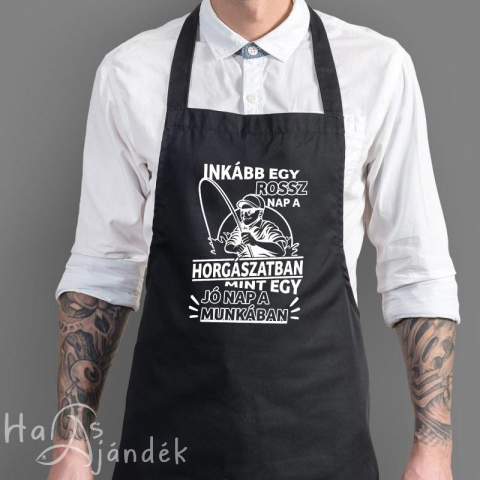 Pecás kötény, inkább egy rossz nap a horgászatban mint egy jó nap a munkában feliratú kötény. Egy igazi horgásznak, akik sosem adja fel még akkor sem ha nem akadt hal a horogra. Motiváld te is ismerősöd, családtagod ezzel a köténnyel. A kötény fehér szín
