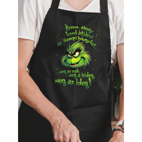 Vicces karácsonyi kötény, ünnepi hangulat. Érzem, ahogy kezd átjárni az ünnepi hangulat, meg az eső, meg a hideg, meg az ideg, humoros feliratos vászon kötény karácsonyra, mókás grincs fejjel. Ajándékötlet barátnődnek, férjednek, családtagodnak. A kötény