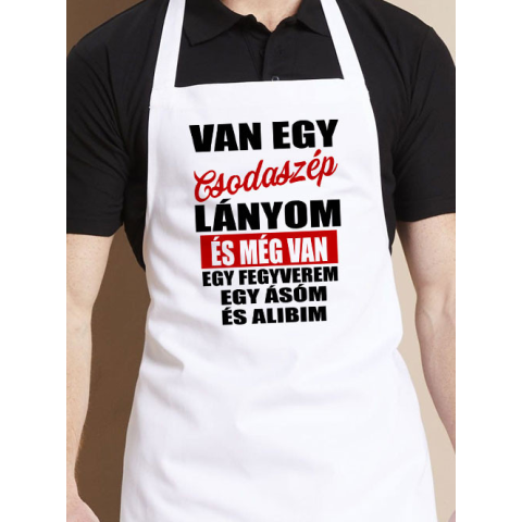 Vicces kötény apáknak, csodaszép lányom van. Van egy csodaszép lányom és még van egy fegyverem, egy ásom és alabim humoros felirattal kötény lányos apukáknak. Megrendelés előtt kiválaszthatod hány lány gyermek van így egy egyedi, személyre szabott kötényt