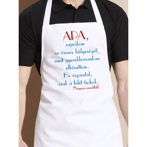 Vicces kötény apáknak, sajnálom a hülyeséget. Feliratos kötény édesapáknak. Ha úgy érzed eljött a beismerés ideje, de nem tudod hogyan mondd el.. segítünk, mondd el köténnyel. Fekete és fehér színben érhetőek el kötényeink, melynek anyaga vászon. Egye