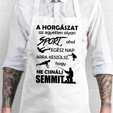 Ajándék pecásnak, sporthorgász kötény. A horgászat az egyetlen olyan sport, ahol egész nap arra készülsz, hogy ne csinálj semmit humoros feliratos kötény. Meglepetés születésnapra, névnapra, karácsonyra a legjobb sporthorgásznak. Fehér kötény esetén a mi