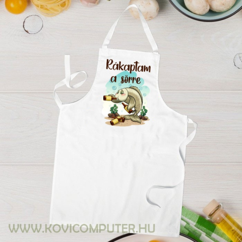 Vicces kötény horgásznak, Rákaptam a sörre felirattal. Lepd meg pecás ismerősödet vagy családtagodat egy vicces köténnyel. Mérete 66x78 cm, anyaga vászon, színe fehér vagy fekete. Egyedi mintával ellátott kötényünk praktikus és stílusos választás főzés