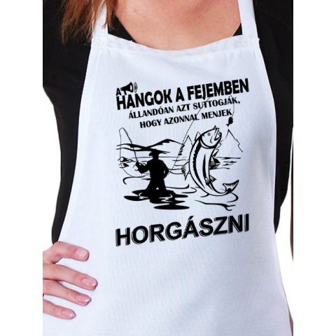 Vicces kötény pecásoknak, hangok a fejemben. Poénos kötény megszállott horgászoknak. A hangok a fejemben állandóan azt suttogják, hogy menjek horgászni felirattal. Fehér színben rendelhető fekete mintával vagy fekete színben is rendelhető fehér mintával.