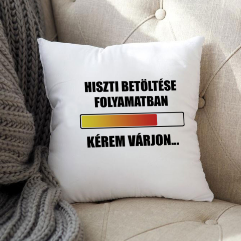 Vicces párna, hiszti betöltése folyamatban. Ez a humoros párna tökéletes ajándék azoknak, akik néha kicsit türelmetlenek vagy épp azoknak, akiknek van a környezetükben egy igazi „hisztibajnok”! A látványos betöltős grafika és a frappáns felirat garantálta