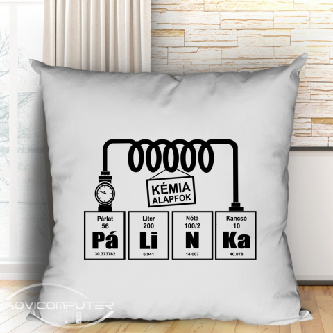 Vicces párna, pálinka párnák. Kémia alapfok csakis igazi pálinka szakértőknek. Ajándék születésnapra, névnapra minden pálinka kedvelő férfinak és nőnek. A párna színét is Te választhatod ki ezzel egyedivé téve a meglepetést. A párna mérete 40x40 cm, a