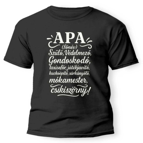 Kiváló minőségű, feliratos póló apukáknak. Anyaga: pamut Apa: szülő, védelmező, gondoskodó, taxisofőr, játékjavító, kuckóépítő, sárkányölő, mókamester, csikiszörny.