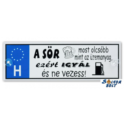 Vicces rendszámtábla, A sör most olcsóbb, mint az üzemanyag, ezért igyál és ne vezess! 2 db tapadókoronggal lehet rögzíteni, amiket adunk hozzá. Anyaga: műanyag Mérete: 33 x 11 cm Vicces rendszámtábla műanyagból, tréfás felirattal, amit 2 db tapadókoro