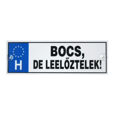 Vicces rendszámtábla, Bocs, de leelőztelek 2 db tapadókoronggal lehet rögzíteni, amiket adunk hozzá. Anyaga: műanyag Mérete: 33 x 11 cm Vicces rendszámtábla műanyagból, tréfás felirattal, amit 2 db tapadókoronggal lehet az ablaküveg belső felére rögzít