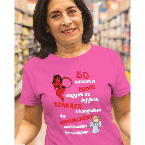 Vicces szülinapi női póló, ördög az ágyban. Humoros szülinapi női póló választható életkorral. Ördög vagyok az ágyban, szakács a konyhában és angyalként viselkedek társaságban felirattal pamut póló, minden korosztály számára. Többféle szín és méret közül