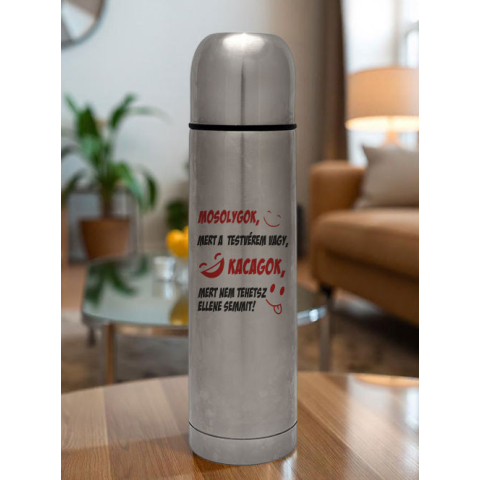 Vicces termosz testvérnek, nem tehetsz ellene. Mosolygok mert a testvérem vagy, kacagok, mert nem tehetsz ellen semmit humoros feliratos ajándék termosz testvéreknek. Rendeld meg hugodnak, nővérednek, öcsédnek, bátyádnak, a mosoly és kacagás biztosan nem