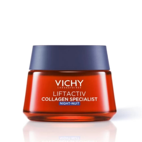 Vichy Liftactiv Collagen Specialist Éjszakai Arckrém 50 mlA Vichy Liftactiv Collagen Specialist Komplex öregedésgátló éjszakai arckrém a nap során felgyülemlett, bőrünket igénybe vevő külső tényezők hatásait célozza meg.Feszesítő tulajdonságú Peptideket, valamint ragyogást adó Cg-vitamin és természetes eredetű Rezveratrol összetevőket tartalmaz.Az éjszaka során erősíti és ellenállóbbá teszi a bőrt a környezeti hatásokkal szemben.Azoknak a nőknek javasol