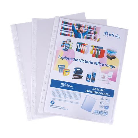Genotherm, lefűzhető, A4+, 55 mikron, víztiszta, VICTORIA OFFICE -A4 méretű katalógusok, könyvek, dokumentációk tárolására -víztiszta feület -megerősített élek -szélesített (A4+) kivitel, akár 50 lap tárolásáa is alkamas -11 lefűzőlyuk -bármelyik szab