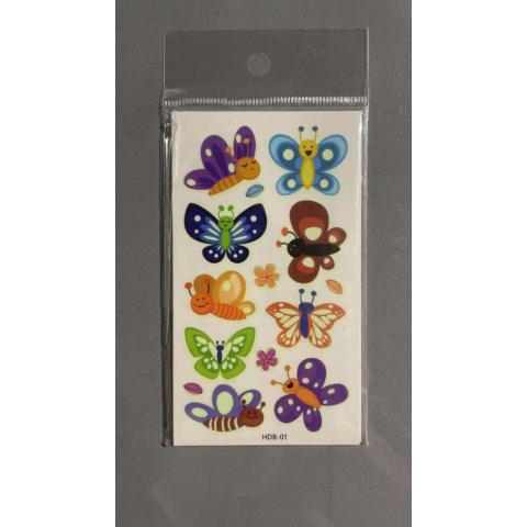 Vidám, színes pillangós tetoválás szett gyerekeknek. Egy csomagban 10 darab különböző tetoválás található – a minták véletlenszerűek, így minden csomag meglepetés! 3 éves kortól ajánlott.