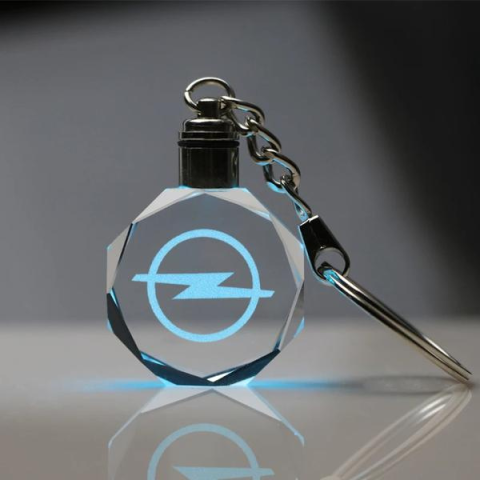 Világító Opel kulcstartó üveg medállal és fém alapanyaggal. Ideális ajándék Opel rajongóknak mindennapi használatra