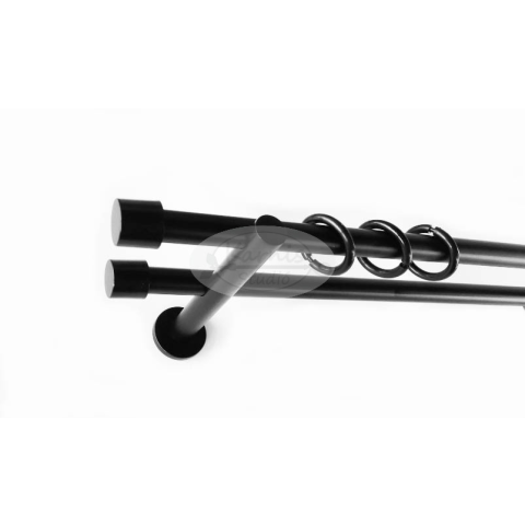 A VILLÁNY fekete 300 cm-es, 2 rudas, modern tartós fém karnis szett tartalma: 2 db 300 cm-es fekete színű, 16 mm átmérőjű fém karnisrúd 4 db Villány típusú kis kupak végzáró 3 db falra szerelhető fém konzol 60 db fekete műanyag függönykarika ráncszedő ka