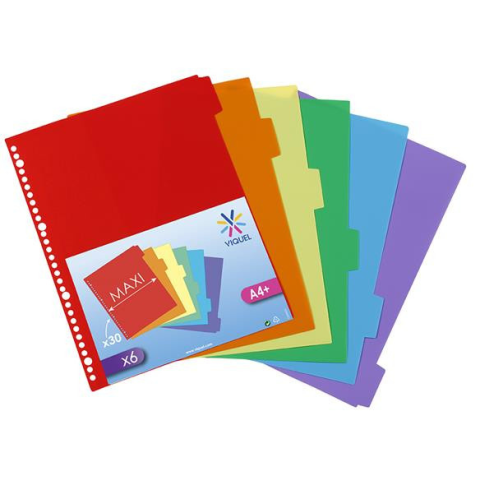 Regiszter, műanyag, A4 Maxi, 6 részes, VIQUEL anyaga: áttetsző polipropilén mérete: 245x305mm lyukasztott (általános - 30 lyuk) lapok színei: piros, narancs, sárga, zöld, világoskék, lila Gyártó/első EU forgalmazó elérhetősége: VIQUEL SAS 14 Rue de M