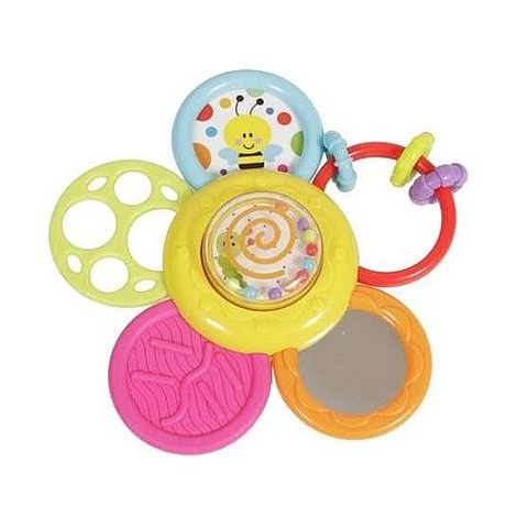 Pörgesd a vidám virágot, ami még zörögni is fog! A Virág alakú rágóka bébijáték egy műanyagból készült forgó virág, amit tapadókoronggal lehet sima felületre erősíteni. A virág minden szirma más-más meglepetést tartogat a picinek, a virágon tükör, csörgő karikák is találhatók. A játék rágókaként is használható, a közepét lenyomva a virág sípoló hangot ad. A Virág alakú rágóka bébijáték átmérője: 16 cm.
