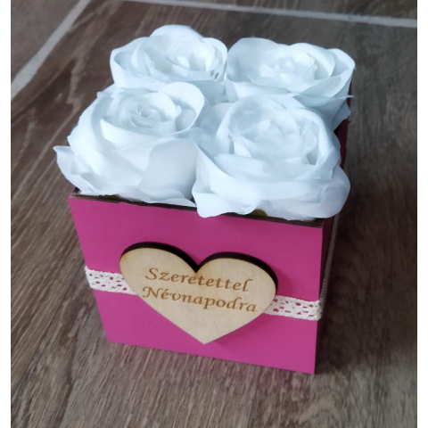 Rétegelt lemezből készült, 10 x 10 cm-es alapterületű és 10 cm magas, festett /magenta/ , gravírozott virágdoboz. 4 db élethű selyemvirággal, csipkeszalaggal. A festék egészségre ártalmatlan vízbázisú akrilfesték. Fából készült virágdoboz élethű sely