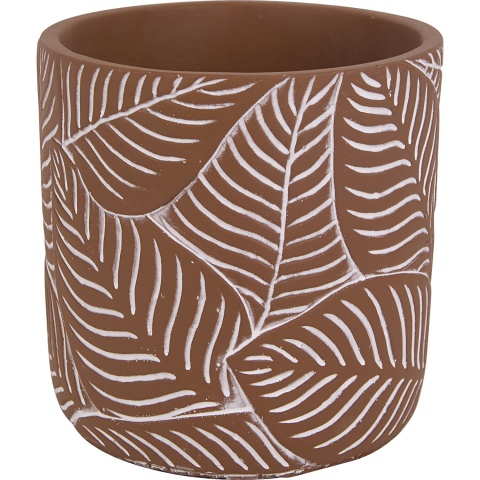 A dekoratív virágtartó kisebb és közepes méretű növények beltéri elhelyezésére alkalmas. Magassága 14,5 cm, átmérője 14,5 cm. A virágtartó barna színű cementből készült. Modern növényi mintázatával és strukturált felületével gyönyörű látványt nyújt otthonában - akár a komódra, akár az ablakpárkányra vagy a polcra helyezi.