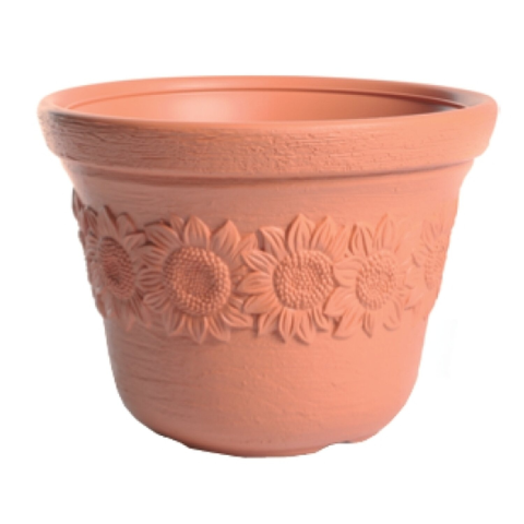 Kiváló minőségű műanyag cserép, mely felületi struktúrájának köszönhetően valódi agyagcserép hatását kelti. Napraforgós mintájával látványos kiegészítője a kerteknek, teraszoknak.