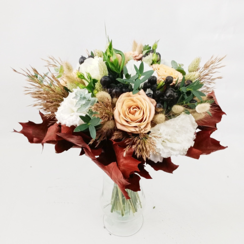 Bohém Őszi Költemény Összetétel: Púderes-barackos/homokszínű rózsa Fehér szegfű vagy krizantém (aprófejű) Fehér/krém eustoma (lisianthus) Sötétlila/fekete díszbogyók Szárított, barna, tollas díszfüvek (pl. Pampafű) Fehér-zöldes kalászok/virágzatok Bordó