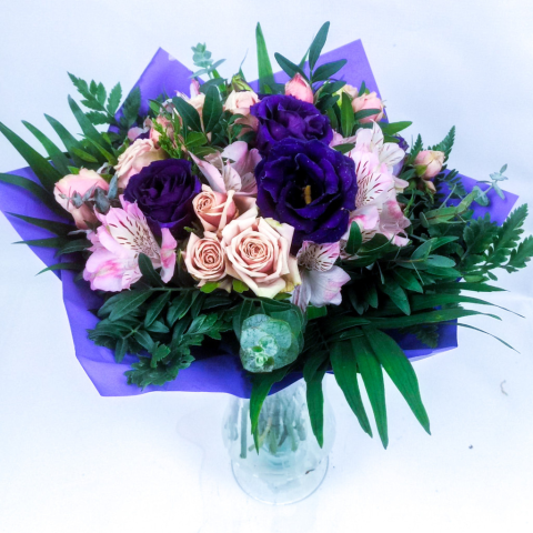 Bíbor Elegancia Virágcsokor Összetétel: Mély lila eustoma (liziantusz / préritárnics) Halvány rózsaszín rózsa Fehér-lila alstroemeria (inkaliliom) Dekoratív zöldek (pl. páfrány, eukaliptusz) Bíbor Elegancia Virágcsokor Sötét Rózsával, Liziantuss